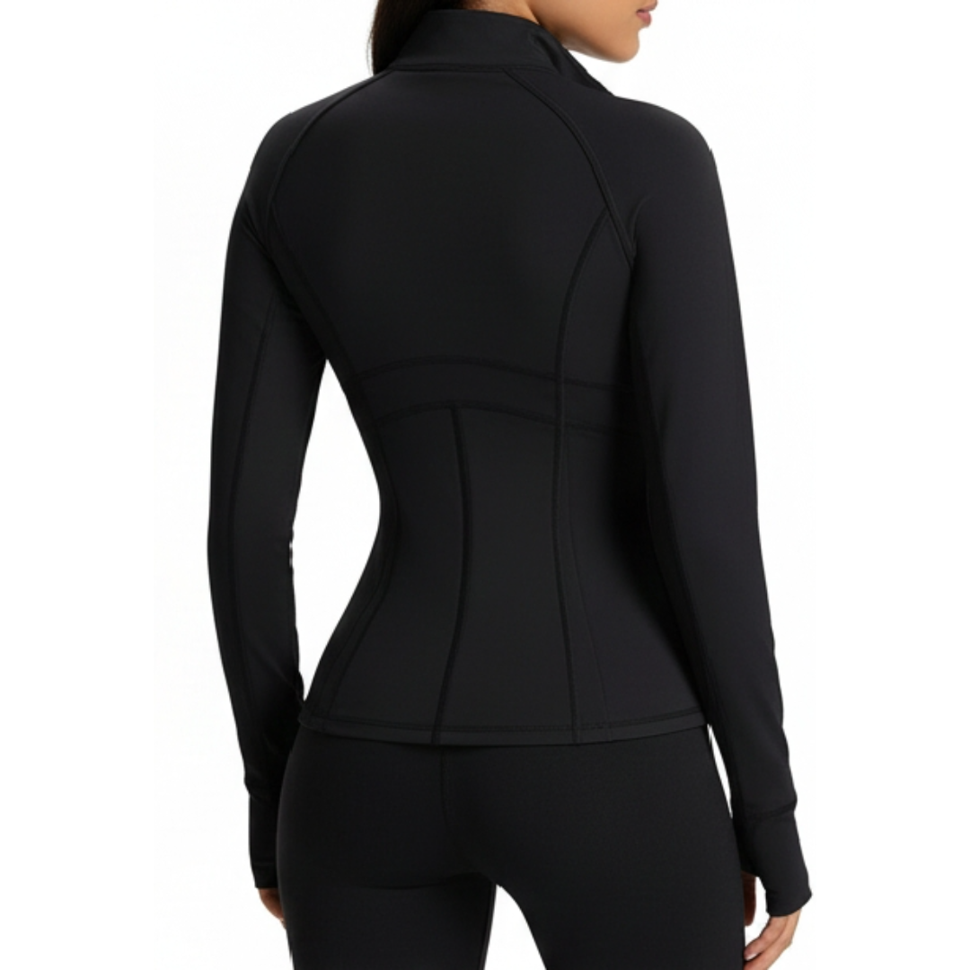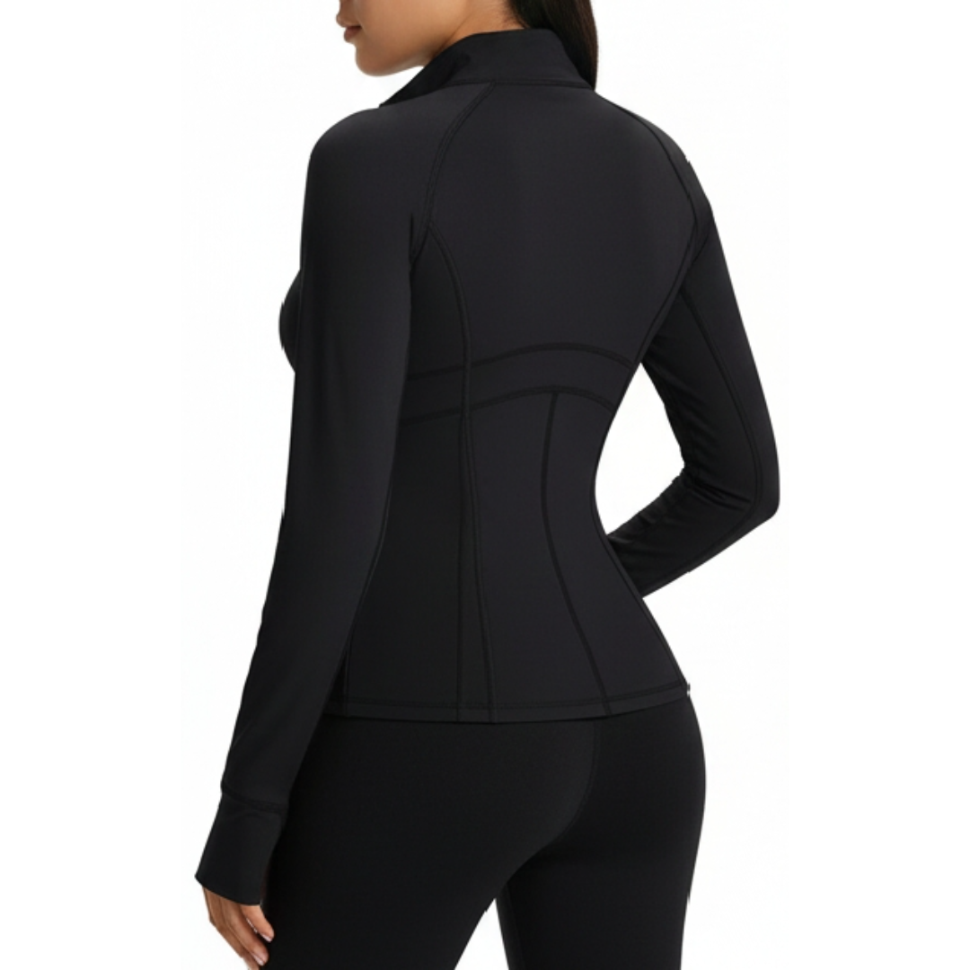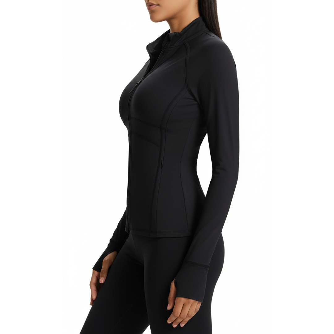 Features a premium Midnight Onyx (Black) monochromatic palette with a high-neck, full-zip front and a streamlined, tailored fit. |
