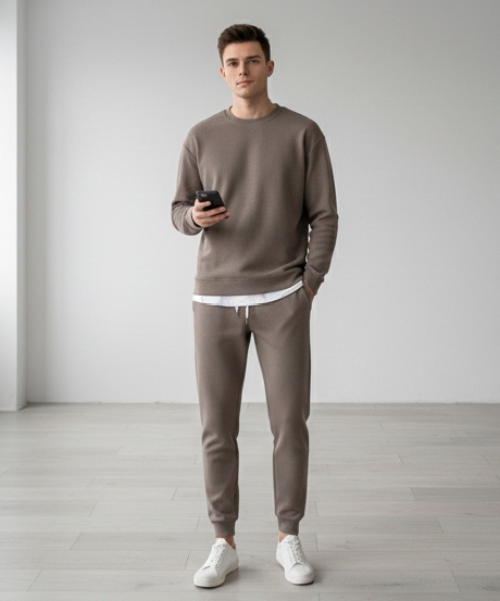 | Aesthetic Design | Features a sophisticated Taupe/Stone monochrome palette with a streamlined, slim-fit silhouette that bridges the gap between loungewear and streetwear. |