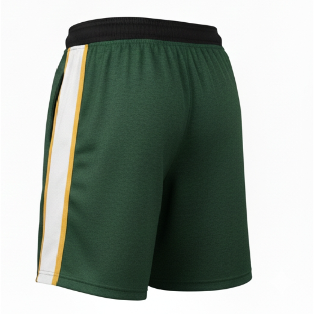 Features a classic Forest Green heathered body with a contrasting black elastic waistband and bold white and gold side racing stripes. |