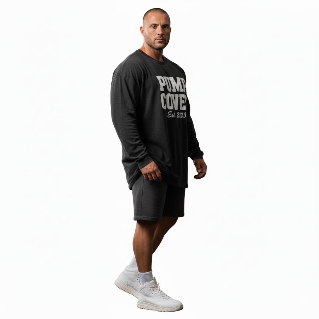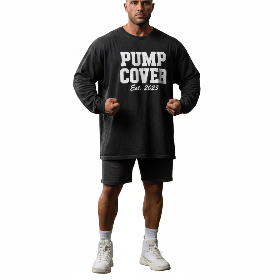 Features a vintage Washed Charcoal Black base with high-impact, distressed “PUMP COVER” block lettering and “Est. 2023” script. |