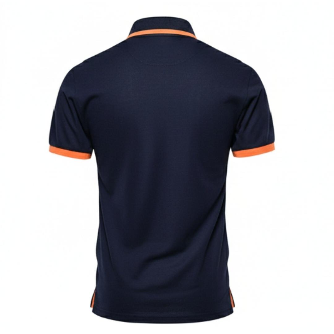 Features a deep Midnight Navy base with high-visibility Orange Zest contrast accents on the placket, inner collar, and sleeve cuffs. |